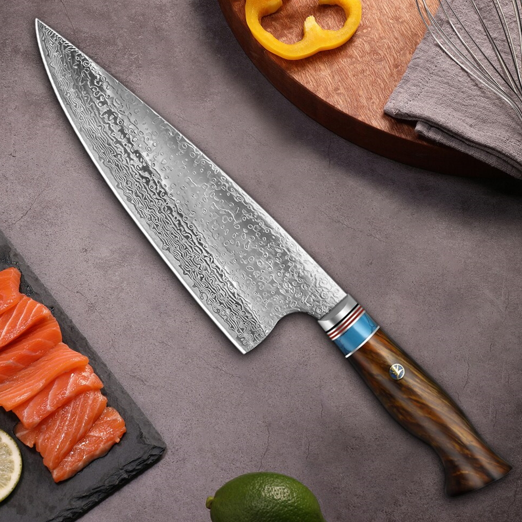 Chef knife Material: laminated steel,stainless HRC 58-60 Length: 330 mm(13″) Blade length: 210 mm(8.3″) Blade width: 57 mm(2.2″) Handle: wood,steel Thickness: 2.5 mm
