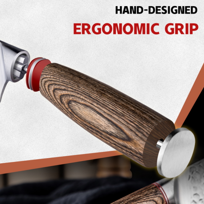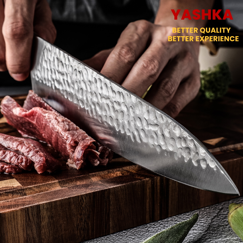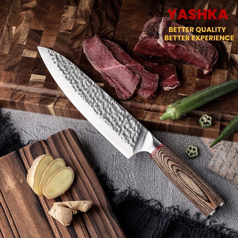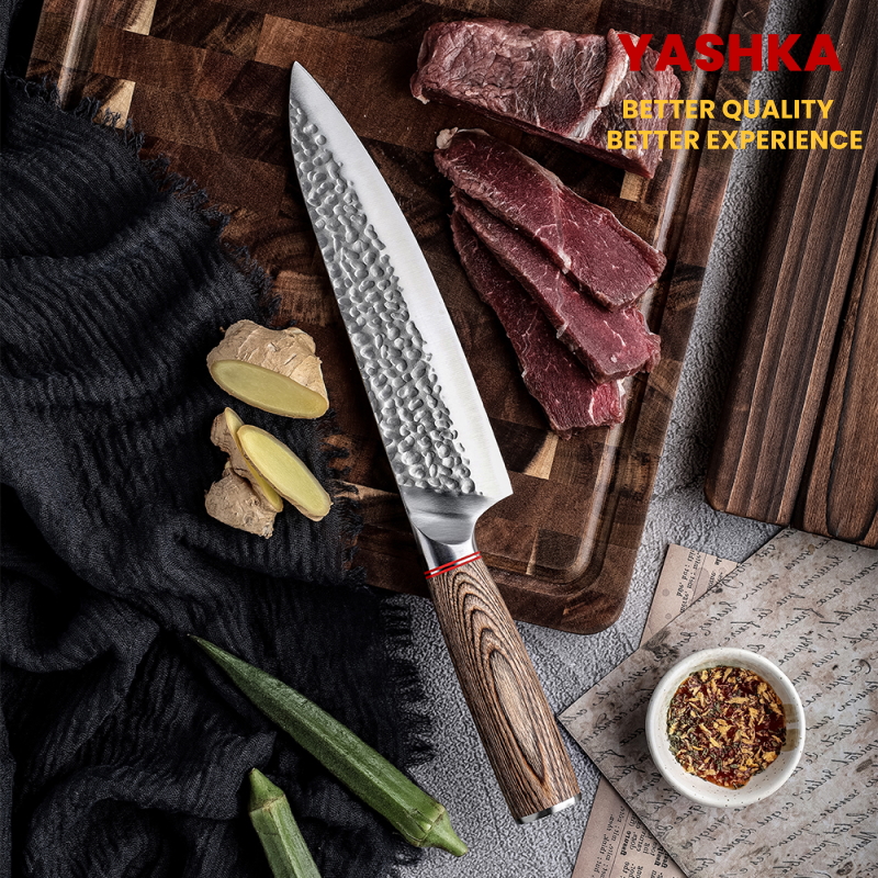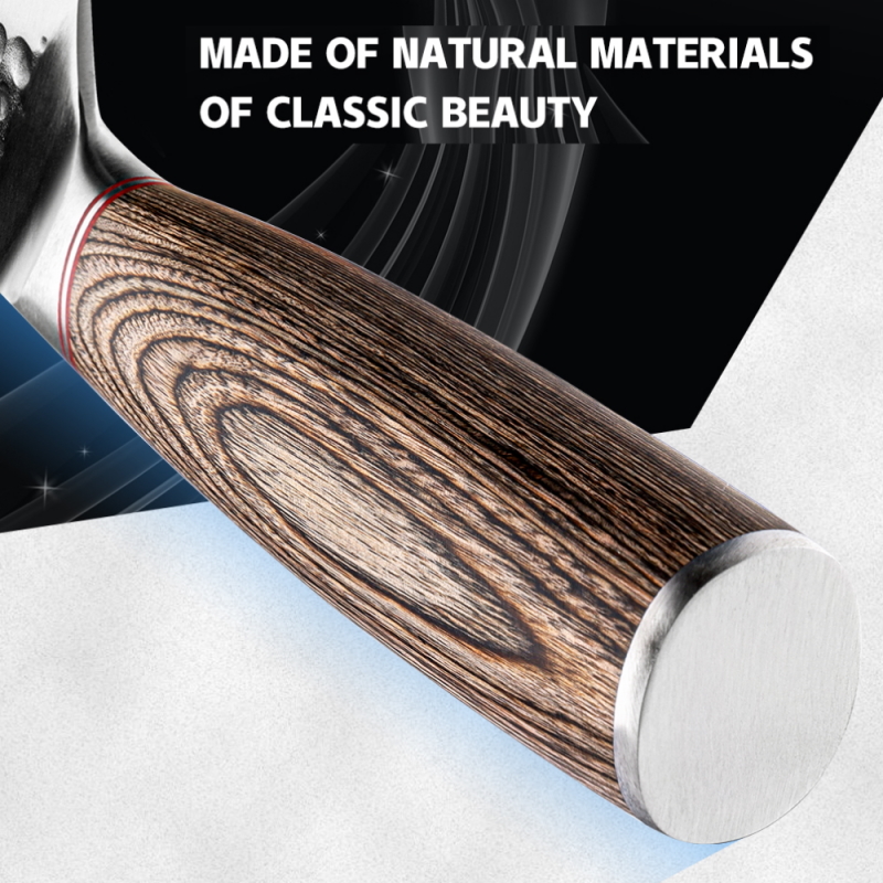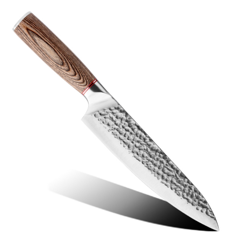 Chef knife Steel: High carbon alloy HRC 57-58 Length: 330 mm(13″) Blade length: 200 mm(7.87″) Thickness: 2.5 mm Handle: Pakka wood