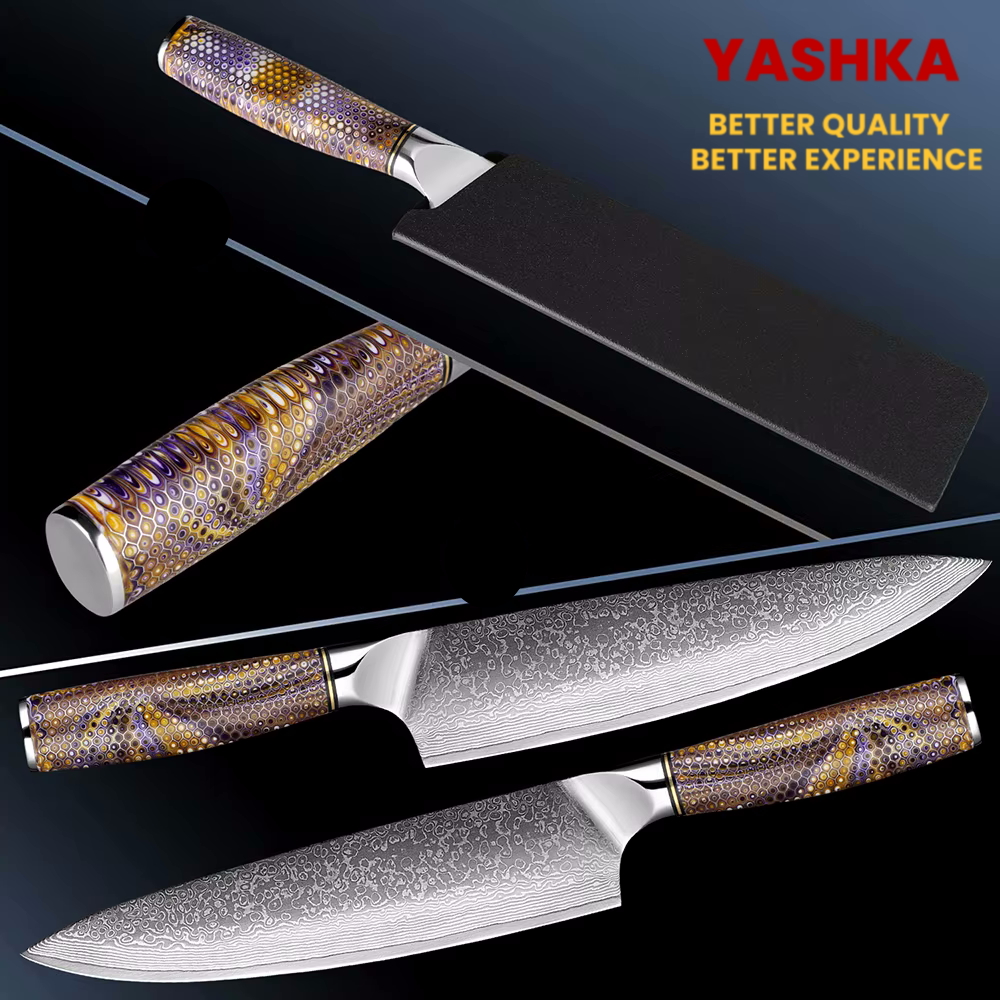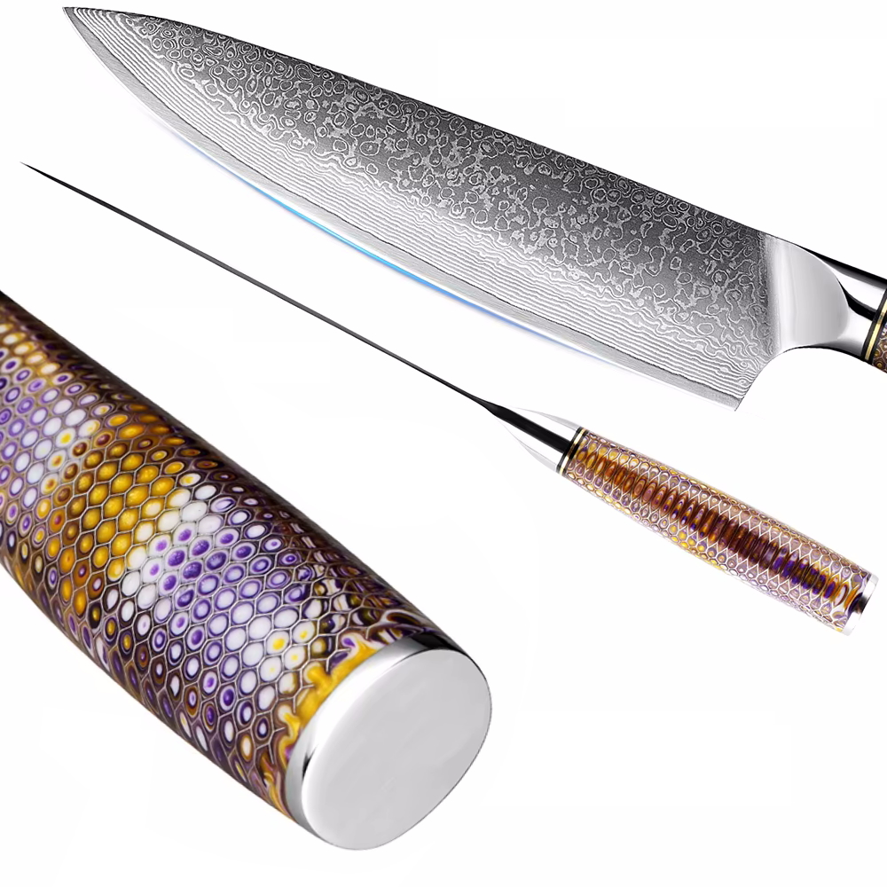 Chef knife Steel: High carbon stainless alloy HRC 59-60 Blade length: 190 mm(7.5″) Thickness: 2 mm Handle: Honeycomb,Resin