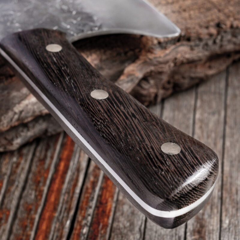 Full Tang handle design of the chef knife makes it easy to grip. Premium Wenge Wood make the knife easy to hold.